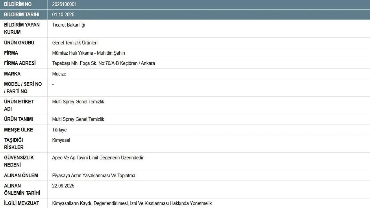 Son listede, Ankara merkezli Mümtaz Halı Yıkama – Muhittin Şahin firmasına ait “Mucize” markalı Multi Sprey Genel Temizlik Ürünü de yer aldı. Bakanlık, bu ürünün satışını yasakladı ve piyasadan toplatılmasına karar verdi.