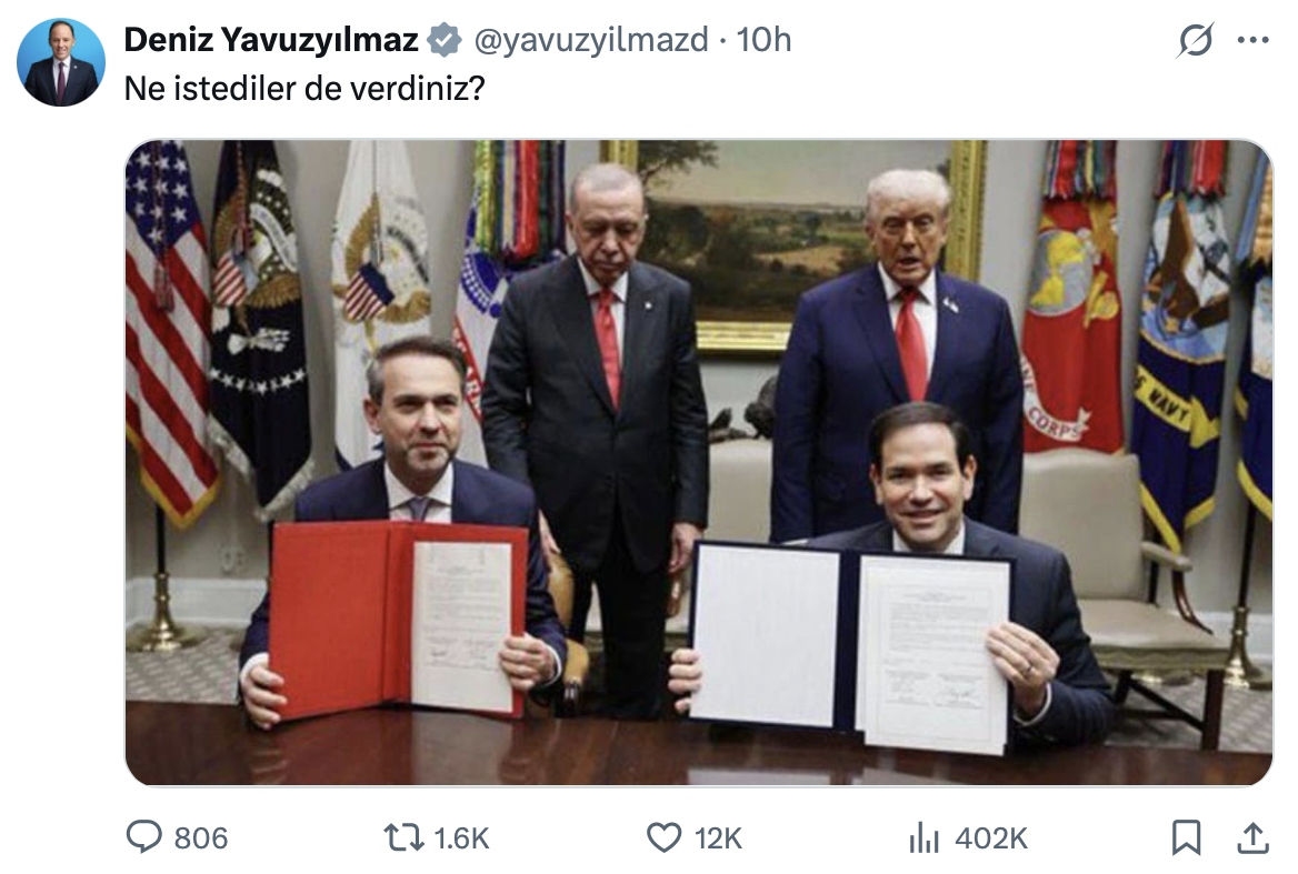 Cumhurbaşkanı Recep Tayyip Erdoğan, ABD Başkanı Donald Trump ile dün Beyaz Saray’da görüştü. Görüşmede, iki ülke arasında, “Stratejik Sivil Nükleer İşbirliği Anlaşması” imzalandı. CHP Genel Başkan Yardımcısı ve Zonguldak Milletvekili Deniz Yavuzyılmaz sosyal medya hesabı üzerinden, imzalanan nükleer anlaşmaya ait fotoğrafı paylaşarak, “Ne istediler de verdiniz? ” notunu düştü.